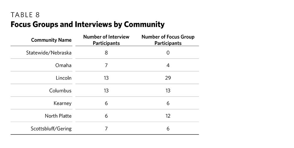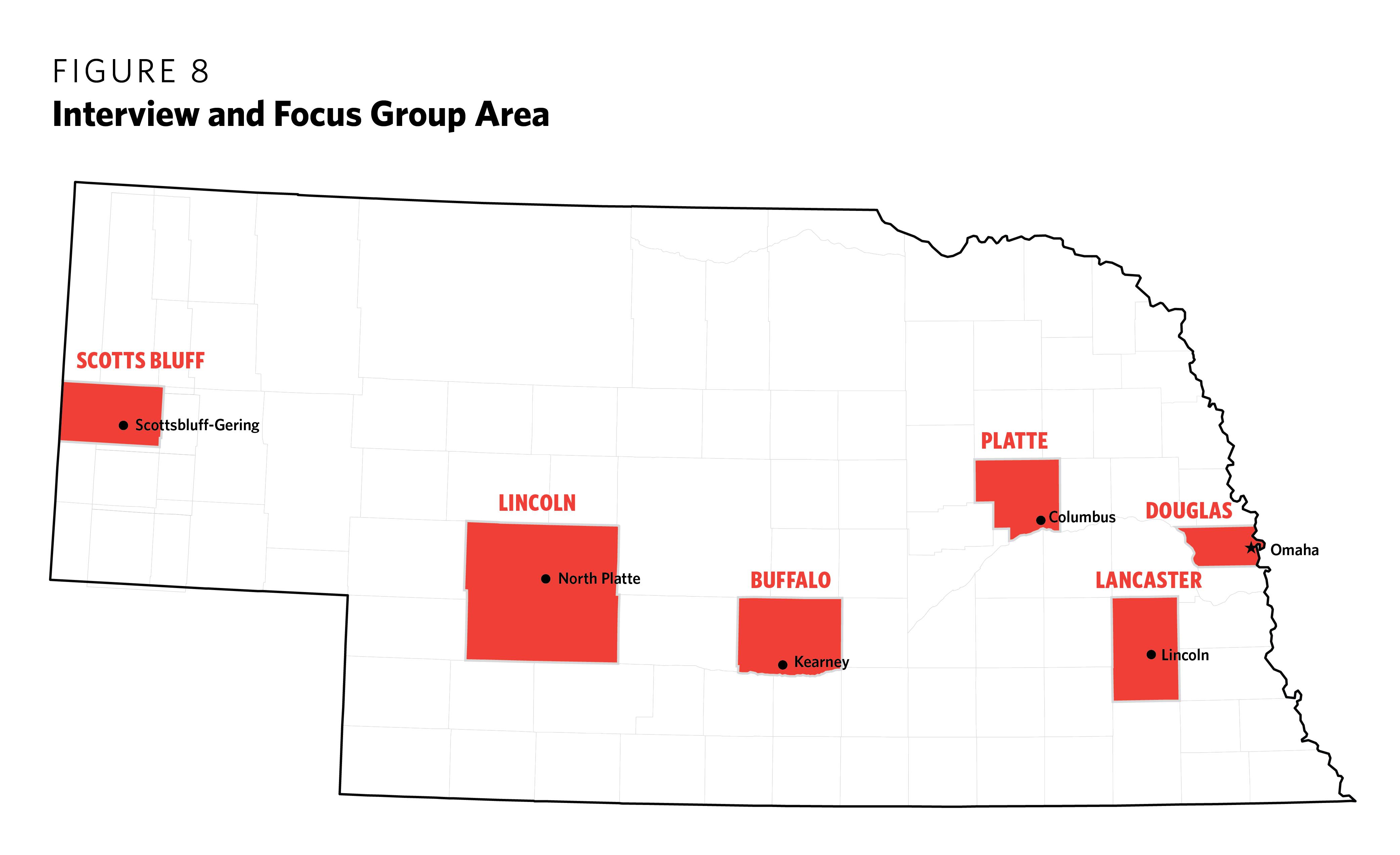 The vast majority of those interviewed reported residing in middle-income households, albeit generally above the median. The interviewees tended to be more male, white, older, and better educated than is representative of Nebraska’s workforce, but the sample is consistent with the demographics of those in community leadership positions across the state. Outside the major cities, the majority of these individuals described themselves as traditional Republicans; most of those in the Lincoln and Omaha areas characterized themselves as center-right or center-left, as opposed to being on the far-right or far-left of the political spectrum. That said, the team met with participants that spanned a wide range of incomes, education levels, and political affiliations. They offered $50 cash incentives and meals to encourage the participation in focus groups of those who might not otherwise readily engage in academic research.