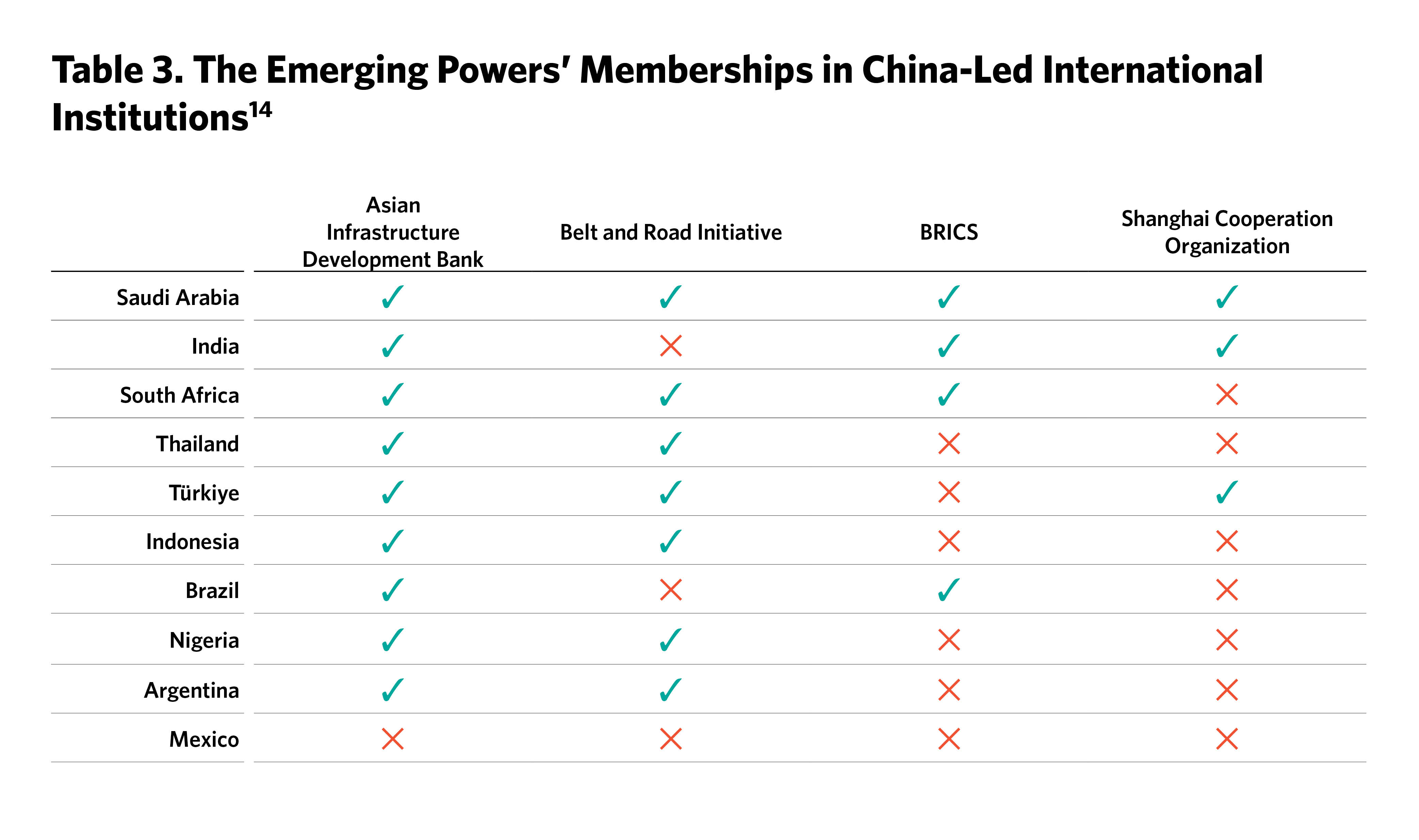 The ten emerging powers are members of the U.S.-led international institutions that emerged after World War II, but they have also favorably greeted China-led forums and institutions created in recent years (see table 3). Membership in the latter does not necessarily signal their alignment with China—after all, several NATO members also joined the Beijing-led Asian Infrastructure Investment Bank, for instance. The emerging powers join such organizations for a variety of reasons, and the cost of doing so is low. However, their interest in these organizations signals their openness to an international order that, in their view, would be less dominated by the West and more multipolar. They are not interested in an order dominated by China, but they value the organizations it has created for their potential to bring about a more fluid, multipolar system that would replace a U.S.-dominated one that they believe has too often denied them full sovereignty or put them at a disadvantage.